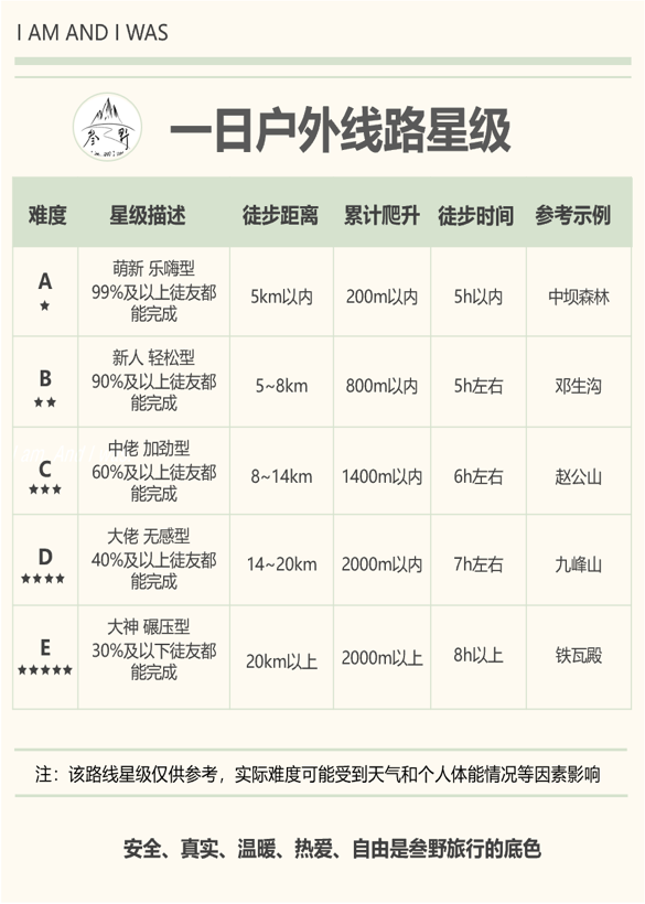 【其他】:雨衣(防止下雨,户外天气多变)、登山杖、20-35L小背包、护膝等依据个人情况携带。